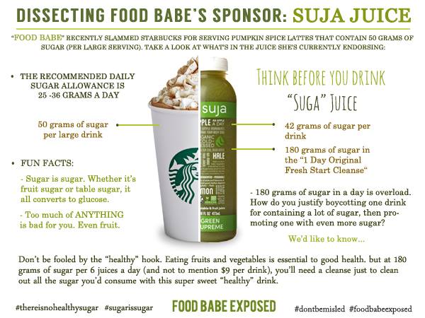 I find it interesting anyone could get any benefit from these juices considering there is no scientific proof juices can remove any toxins or waste from the body that your liver doesn’t already remove. Juice cleanses use the Detox scam. Detoxification has been thoroughly debunked as pseudoscience. Plus the amount of sugar found in one bottle of Suja Juice far outweighs the amount found in the Food Babe’s enemy – The Pumpkin Spice Latte. Suja Juices have 180 grams of sugar per bottle, Pumpkin Spiced Lattes have 50g per drink. Suja Juice gets around this by stating the sugar in their products is purely natural sugar found in fruit whereas other sugars are refined sugars (crystallized sugar that has gone through processing). Even though refined sugar has been processed and natural sugars are – well natural, both types should be limited per day. About 100 calories per day for women and 150 for men. Doing some quick math, there are 4 calories per gram, that would mean for an adult woman – your daily intake of sugar should be 12.96 grams.