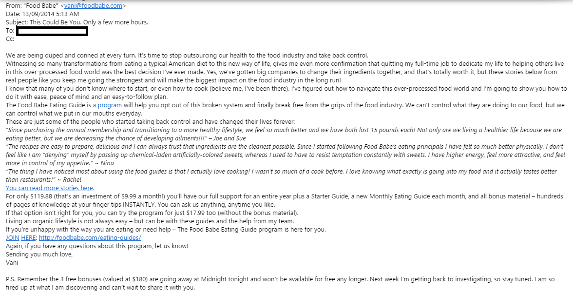 When you sign up to the Food Babe’s mailing list, you get the following email: