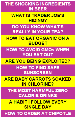 Everyone loves free stuff. Food Babe starts out with her “Food Babe’s Unconventional Habits” PDF which is included in the introductory email when you first sign up to the mailing list. Included in the 2 page PDF are the following topics (each topics header is linked to a blog post elaborating on the topic):