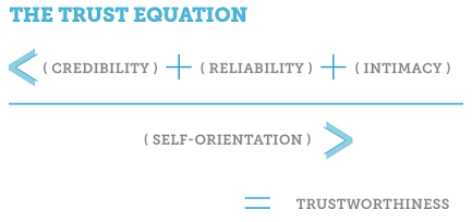 With the Trust Advisor model comes the Trust Equation. From the Trust Advisory website: “The Trust Equation uses four objective variables to measure trustworthiness. These four variables are best described as: Credibility, Reliability, Intimacy and Self-Orientation“.